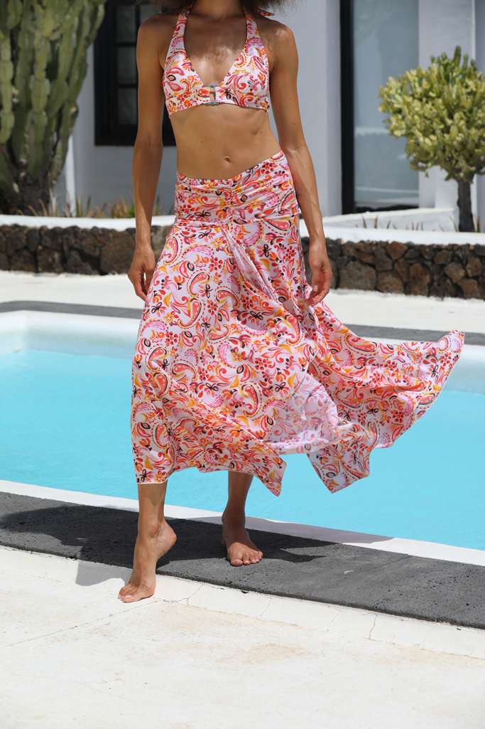 Sa coupe fluide danse au rythme du vent, tandis que sa fente subtile dévoile la jambe avec sensualité et modernité. Portée par-dessus un bikini coordonné ou associée à un top léger, elle crée une allure bohème chic. La Jupe Cindy peut également se porter en robe bustier.