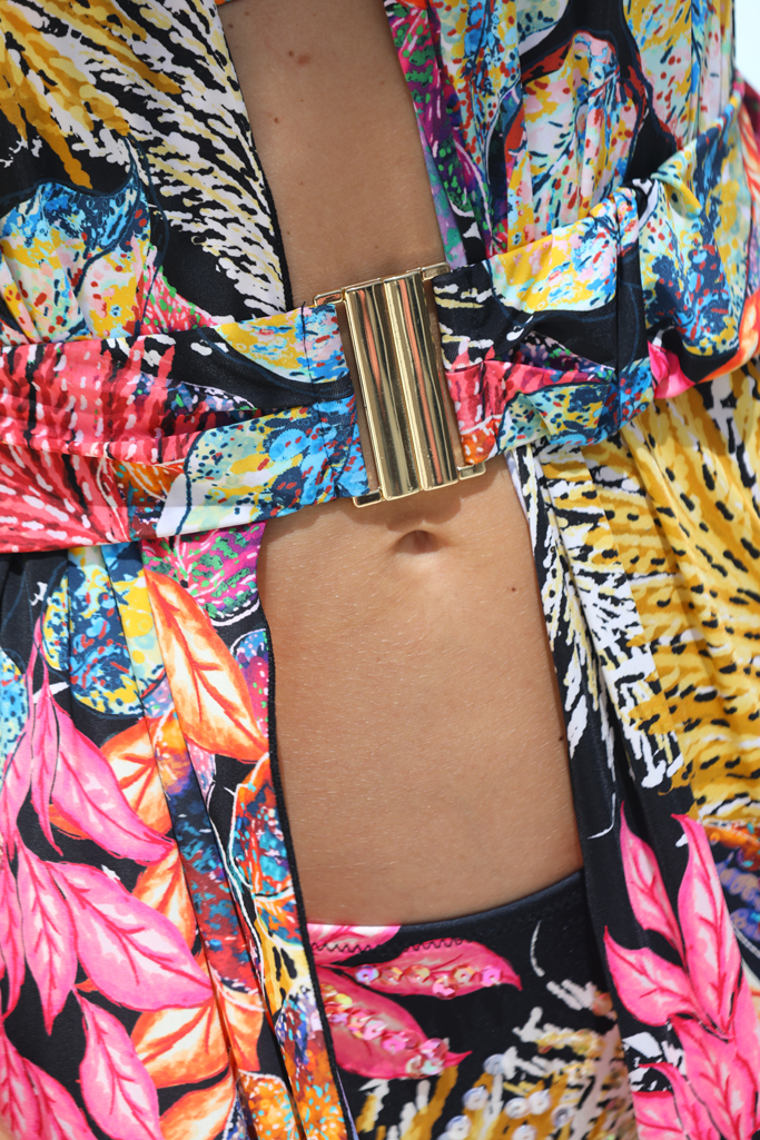 Sa coupe fluide et aérienne s’ajuste délicatement à la taille grâce à une ceinture intégrée, soulignant la silhouette tout en offrant un tombé élégant. Portée ouverte sur votre maillot ou ceinturée pour un effet robe, cette tunique s’adapte à toutes vos envies, de la plage à vos escapades en bord de mer. Elle s’enfile comme une veste et se ferme à l’aide de la ceinture.